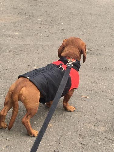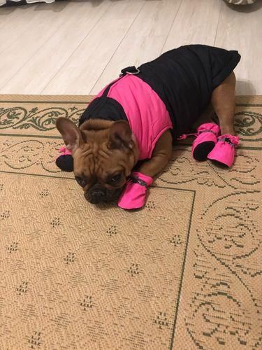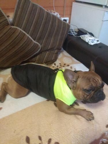 The vest is fantastic with top-notch quality. It fits my French Bulldog’s wide shoulders nicely.